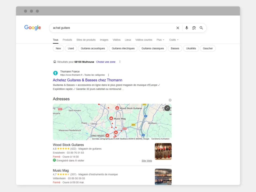 Donc si vous tapez “achat guitare” dans une barre de recherche, il ne va pas se casser la tête à vous montrer en premier les trois petits magasins indépendants de votre région chez qui le nombre de modèles est limité et les prix varient. Vous allez vous lancer dans des comparatifs plus ou moins compliqués et cela va prendre du temps.